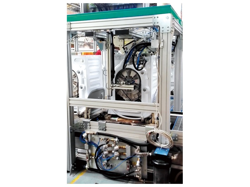 上海博诺自主研发的全自动站位式功能检测,型式为站位式运行,洗衣机运行至检测工位,自动插拔进水阀、排水管、供电插座,检测台位自动运行对滚筒洗衣机各项功能进行跟踪检测。